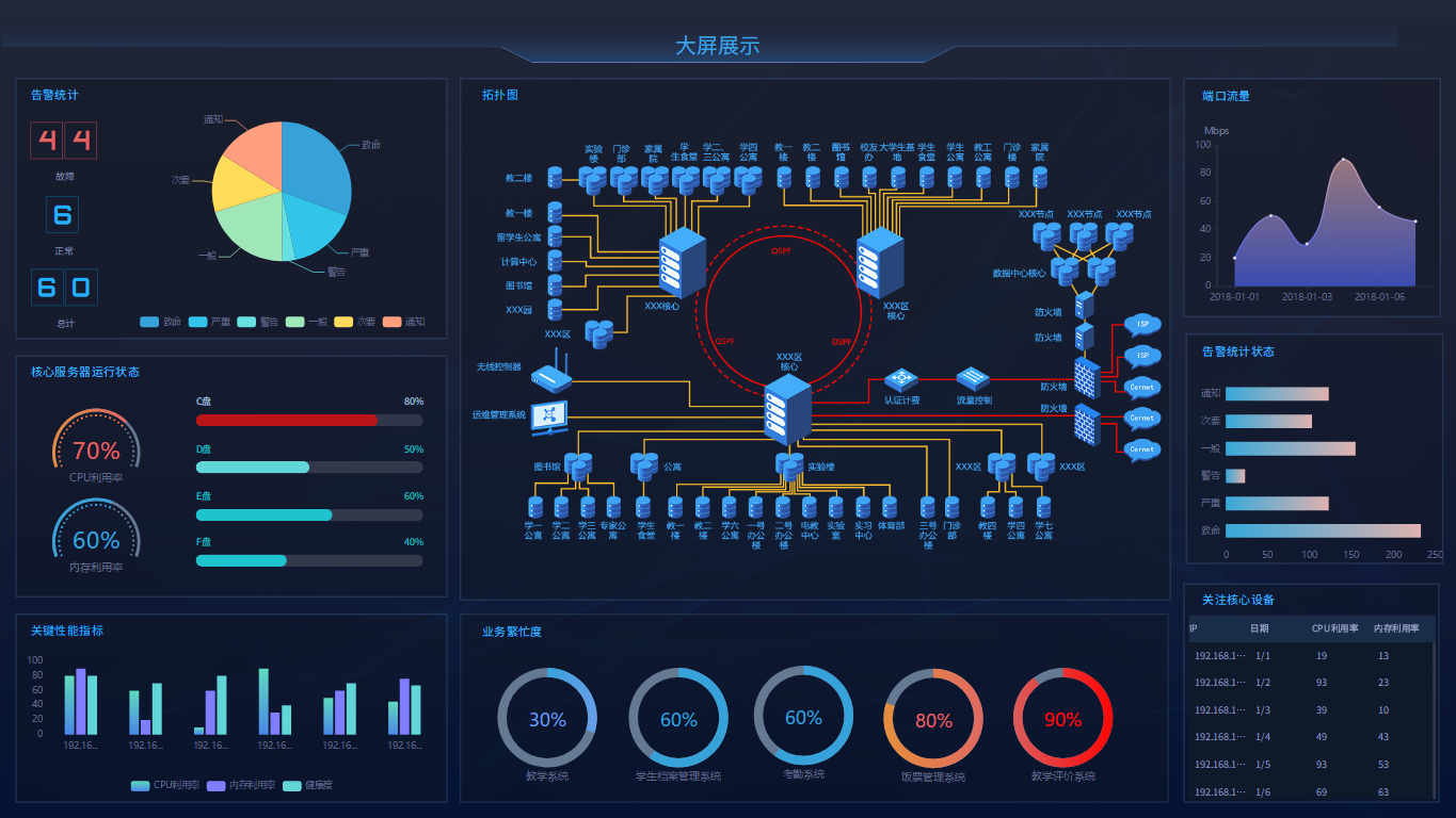 基于设备巡检结果对服务器状态、检测时间等信息进行分类统计,采用图形方式展示统计分析结果,包括报表配置、可用性报表、性能报表、故障报表、综合报表等。用户提供了性能、告警、状态、资源等多个角度的统计和分析报表,降低人工统计分析的压力,方便了解网络状况,为用户决策层提供数据依据。