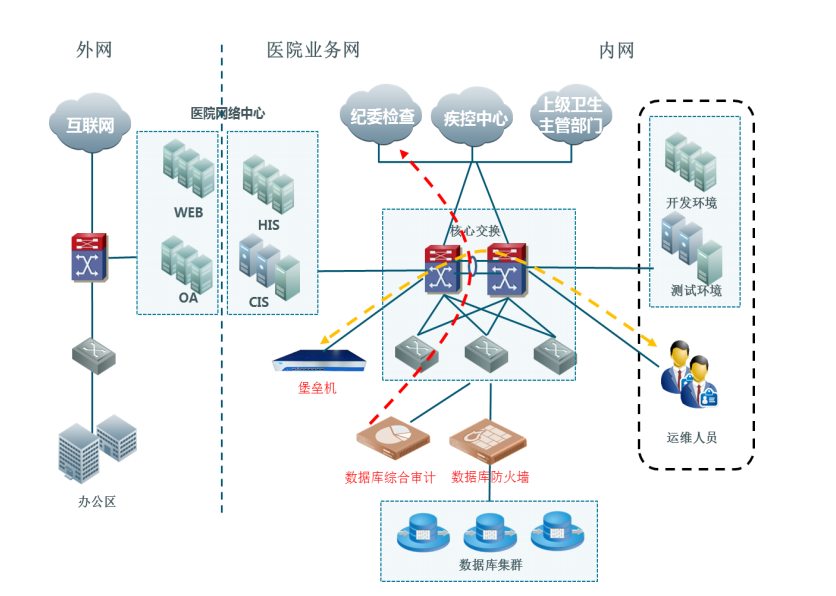 以某医院项目为案例,优炫软件通过完善纵深防御体系,打造事前预防、事中控制、事后审计的安全流程,在数据/业务层加强安全防护,提升整体安全防护能力。具体方案如下: