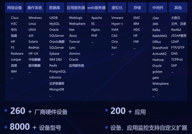 ●智能运维一体机采用协议方式实现对主流厂商的设备进行监控管理。可支持监控管理260+厂商硬件设备、8000+设备型号、200+应用,同时设备、应用监控支持自定义扩展。