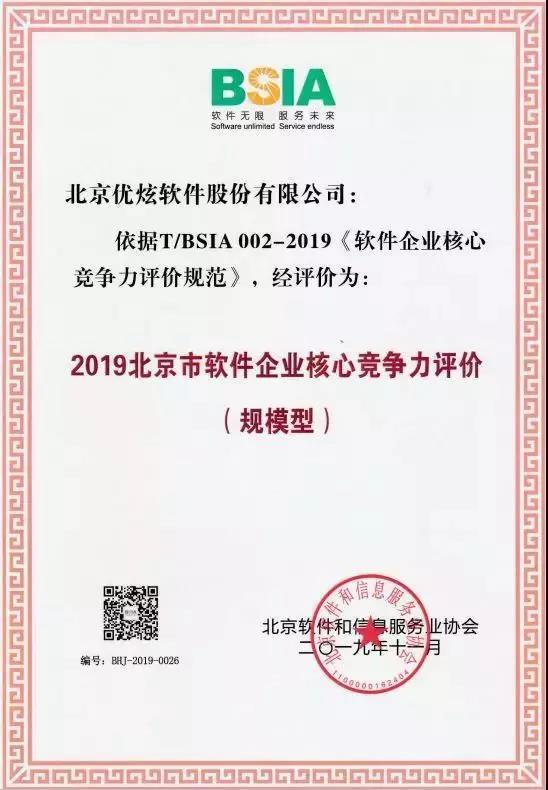 优炫软件荣获“2019北京市软件企业核心竞争力评价(规模型)企业”