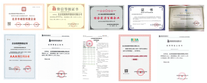 良好的信誉度是企业无形的资本。优炫软件凭借多年的诚信经营和综合实力,赢得了社会各界的广泛认可和尊重。目前拥有业内较为权威的信用资质体系,先后荣获北京市诚信创建企业、中关村科技园区企业信用评级Azc+、海淀区企业信用评级A+、AAA级资信等级企业、北京市软件企业核心竞争力(规模型)企业、北京市软件企业综合实力百强企业、双百工程信用企业等殊荣。诚信经营已内化为优炫软件的精神产品,真诚地奉献给广大客户。