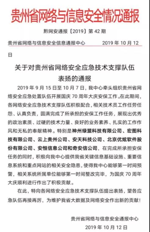 优炫软件作为第一批贵州省网络安全应急技术支撑队伍,全程参与了国庆70周年安保工作。凭借高度的责任心、过硬的技术、扎实的工作,得到了贵州省网络与信息安全通报中心的点名表扬。