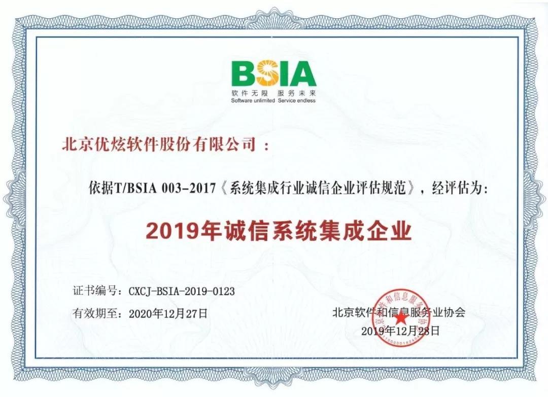 近日,北京软件和信息服务业协会公布了2019年北京市诚信系统集成企业名单,优炫软件凭借多年的诚信经营和综合实力,连续五年荣获“北京市诚信系统集成企业”荣誉称号。