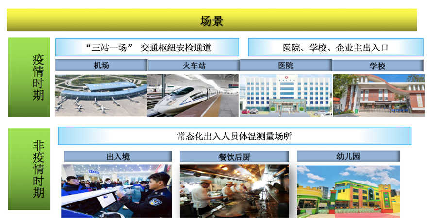 可广泛应用于“三站一场”交通安全枢纽安检通道、企业、园区、医院、学校等各类出入口及人流量集中的公共场所,对通行人员进行非接触式体温检测,迅速发现体温异常者,为整体疫情防治提供精准的数据服务及分析能力。