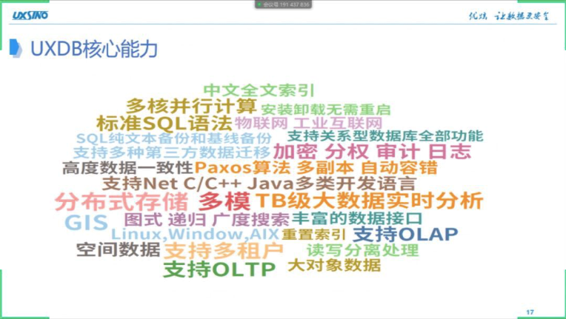 在优炫数据库专题分享中,优炫软件解决方案部咨询顾问吴兴雄针对UXDB的多种特性,为参会嘉宾详细分析了优炫数据库核心特性: