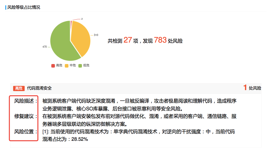 检测报告能够为用户呈现多维度的详细信息,包含基本信息、风险信息、漏洞等级、代码位置、检测过程、漏洞编号(违规对应条目)、解决方案建议等,从而提高排查工作效率和准确性,同时提供专业的安全加固数据方案,以最小代价帮助开发者修复应用漏洞和缺陷。