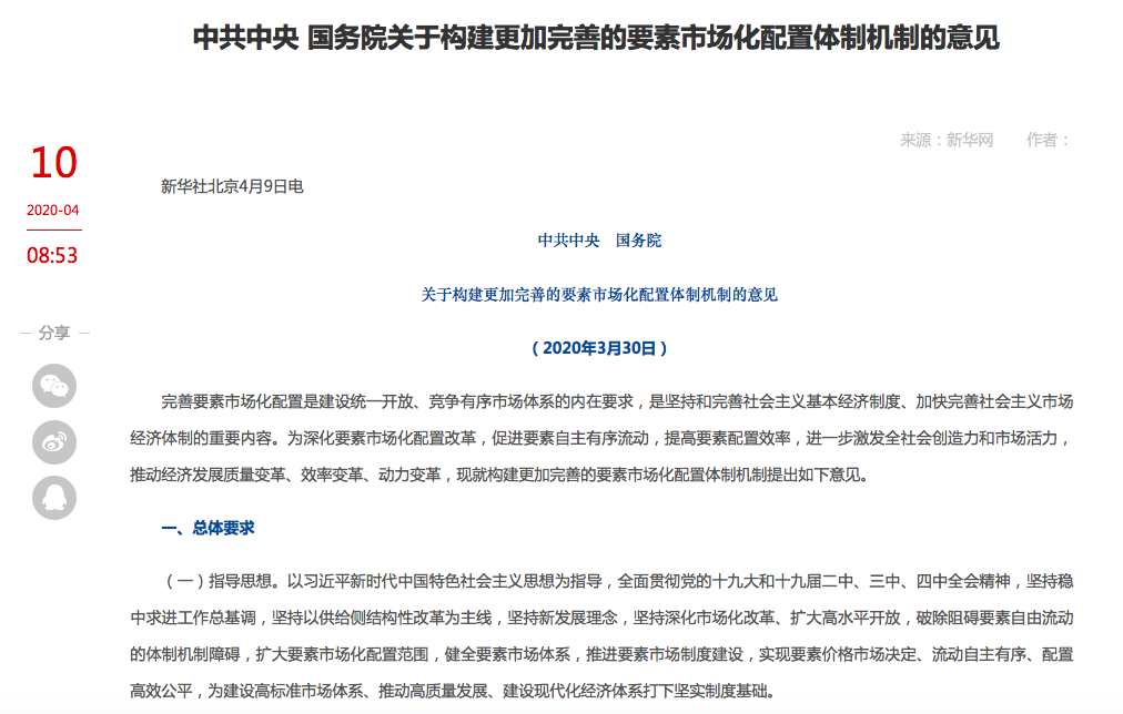 日前,国家发布《关于构建更加完善的要素市场化配置体制机制的意见》,对推进要素市场化配置改革进行总体部署,明确建设方向和重点改革任务。首次将“数据”与土地、劳动力、资本、技术等传统要素并列为要素之一。