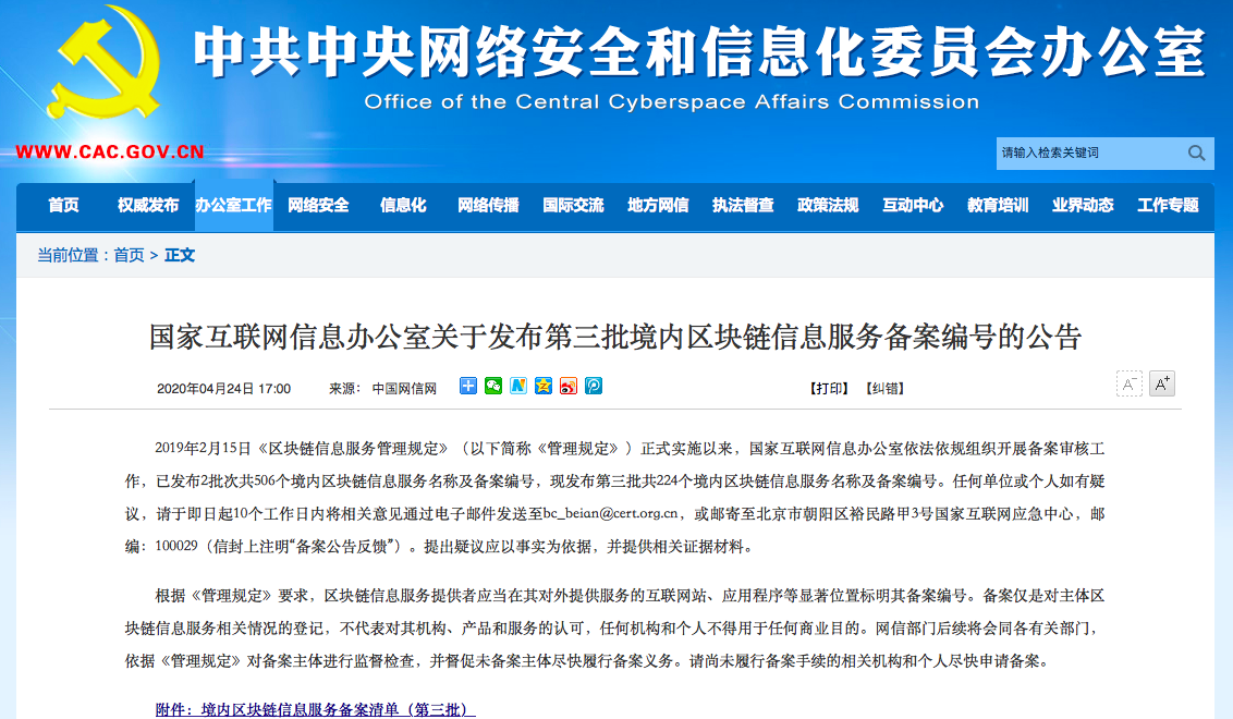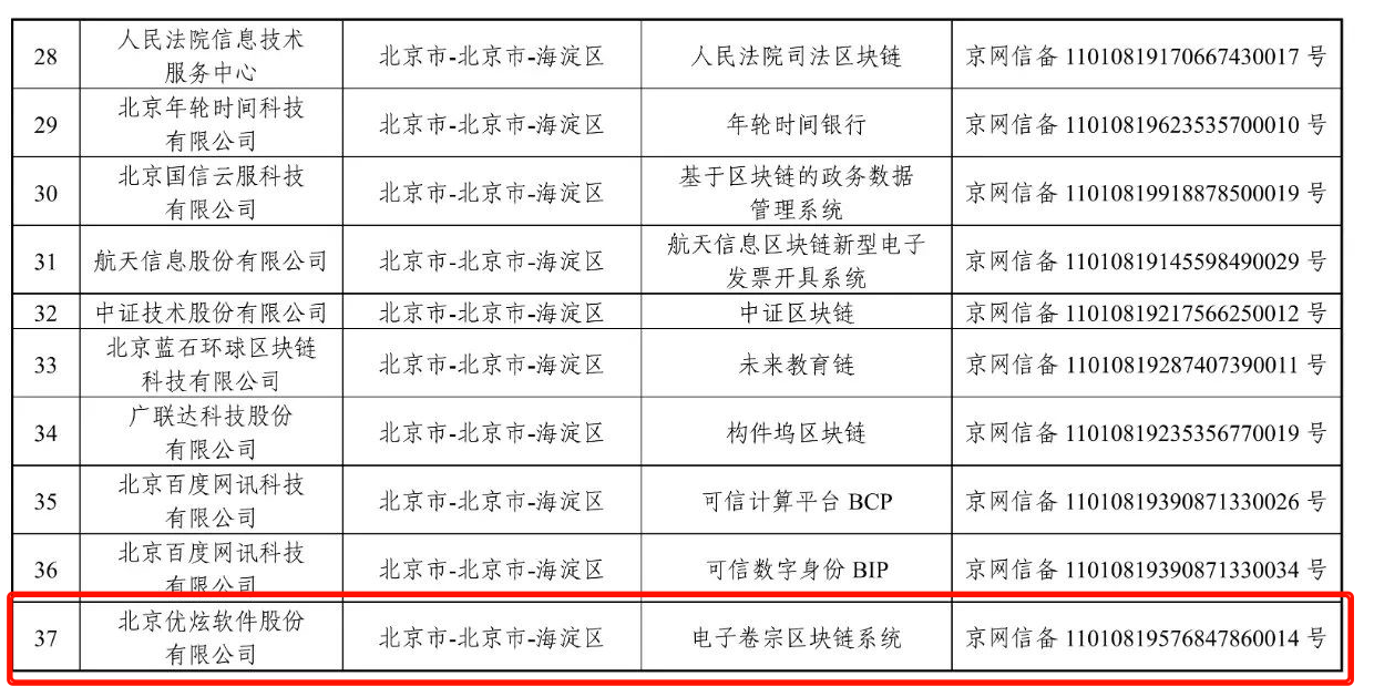 4月24日,国家互联网信息办公室发布了《关于发布第三批境内区块链信息服务备案编号的公告》,优炫软件自主创新“电子卷宗区块链系统”成功入选,成为第三批通过区块链信息服务备案的企业。