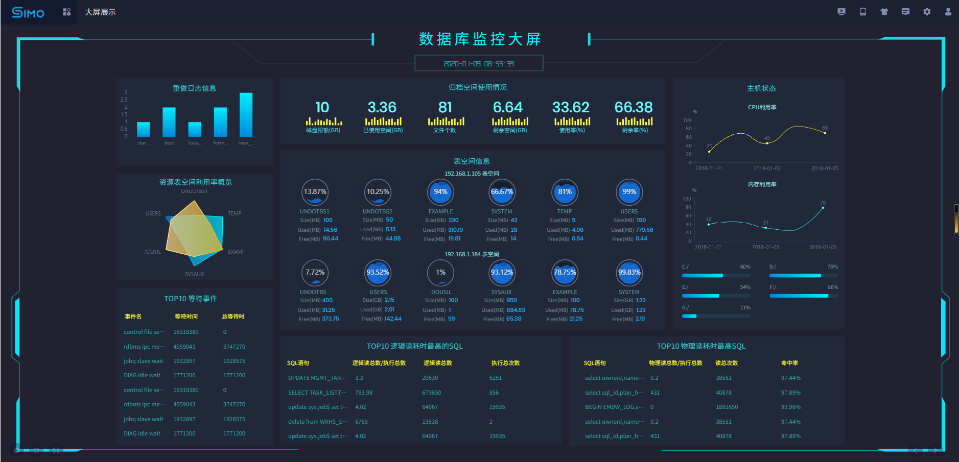 SIMO具备数据库全方位监控及自动巡检能力,支持包括 Oracle,UXDB等主流数据库,可同时采集数据库实例的运行数据,并利用SIMO内置巡检模板,判断采集到的海量数据与数据库问题或故障之间的相关关系,并及时将信息反馈给用户。SIMO一贯优雅漂亮的UI界面,也能帮助用户从各种细节发现操作和展示是如此简单直观。