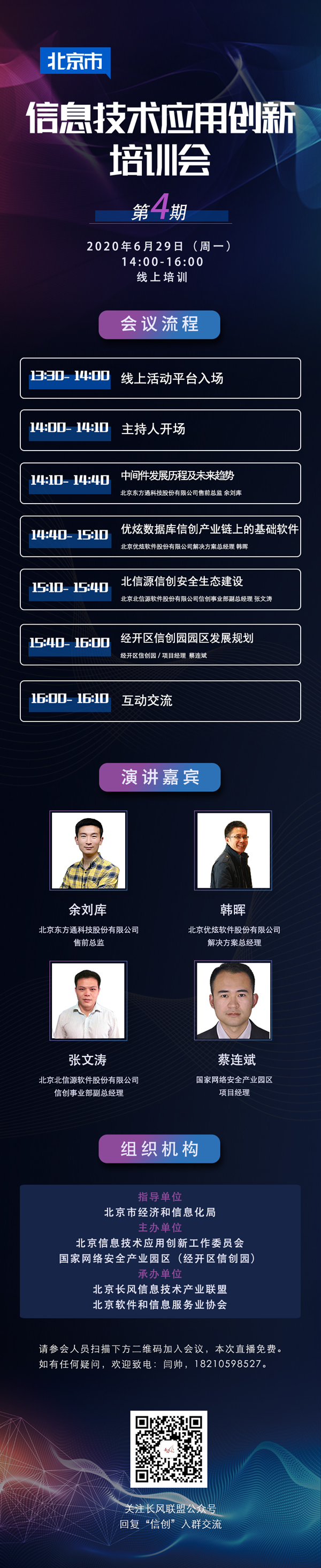 2020年是我国“十四五”规划开局之年,以5G、人工智能、数据中心为代表的新基建和数据要素备受瞩目。信创产业作为筑牢“新基建”自主、创新、安全底座的基石,正迎来黄金发展期。6月29日14:00,在北京市经济和信息化局的指导下,由北京信息技术应用创新工作委员会、国家网络安全产业园区(经开区信创园)主办,北京长风信息技术产业联盟承办的北京信息技术应用创新培训会(第四期)线上培训。