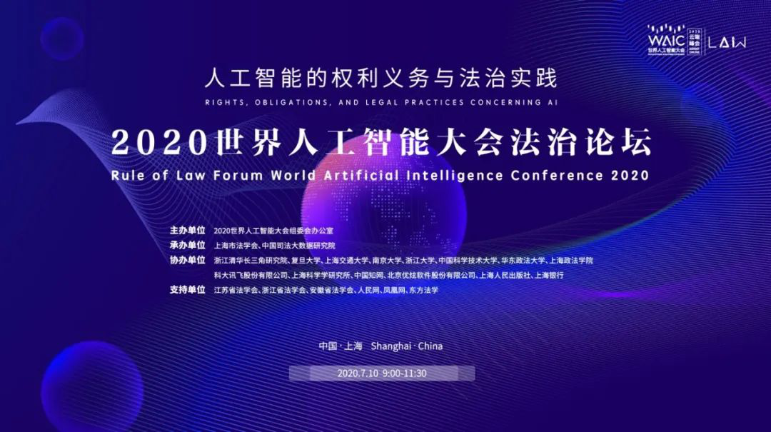 7月10日,由2020世界人工智能大会组委会主办,上海市法学会、中国司法大数据研究院承办,优炫软件、复旦大学、浙江清华长三角研究院、科大讯飞等单位协办,江苏省法学会、浙江省法学会、安徽省法学会等单位支持的2020世界人工智能大会法治论坛在上海世博中心顺利召开。
