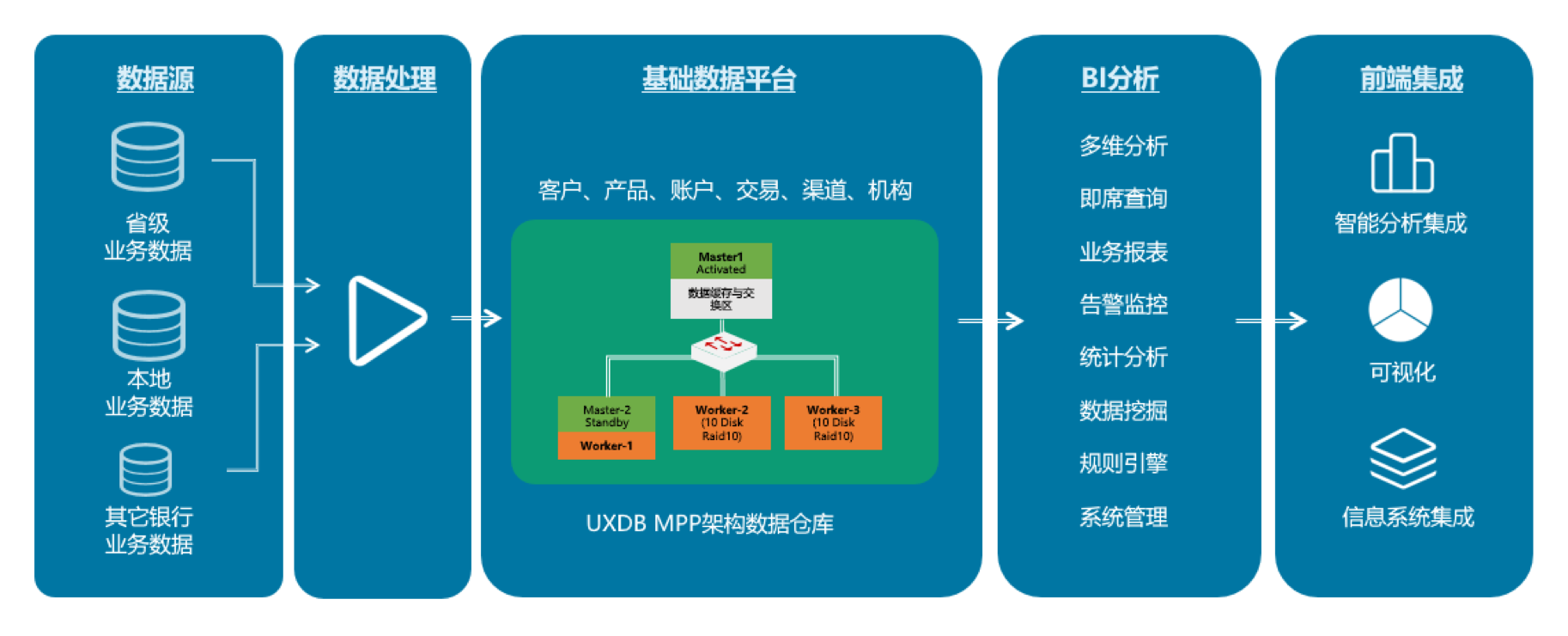 对此,优炫软件为保障银行数据仓库的数据兼容、一致性,满足扩展性与性能需求,设计了成熟地“金融级数据仓库”的部署方案。采用UXDB MPP分布式数据仓库系统,并在生产系统核心数据库和数据仓库之间,引入中间库。基于“shared nothing”架构,多台数据库服务器(节点)形成一个集群,在不中断业务情况下,可实现数据集群在线弹性伸缩,自动容错,系统架构高可扩展,满足业务扩张需求,适用于PB 级的大规模并行处理银行数据仓库。