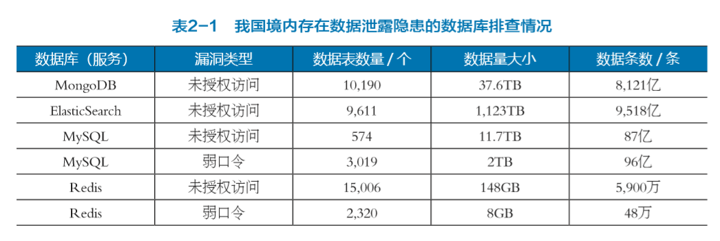 近日,国家互联网应急中心(CNCERT)发布《2019年中国互联网网络安全报告》,其中专门对我国境内数据库隐患排查及处置情况进行公布,据安全内参分析:CNCERT针对境内的MongoDB、ElasticSearch、MySQL及Redis等数据库进行排查,发现大量存在数据泄露隐患,共涉及20720个数据表、1330.3TB数据量、1.78万亿余条数据。