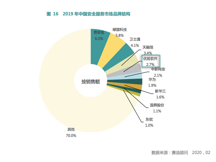 近日,国内权威咨询机构赛迪顾问发布《2019-2020中国网络信息安全市场研究年度报告》。报告显示,2019年中国网络安全市场规模同比增长22.8%,达到 608.1亿元,远高于全球9%的平均增速。其中,优炫软件在安全服务细分领域持续发力,市场份额为2.7%,位居市场前五。