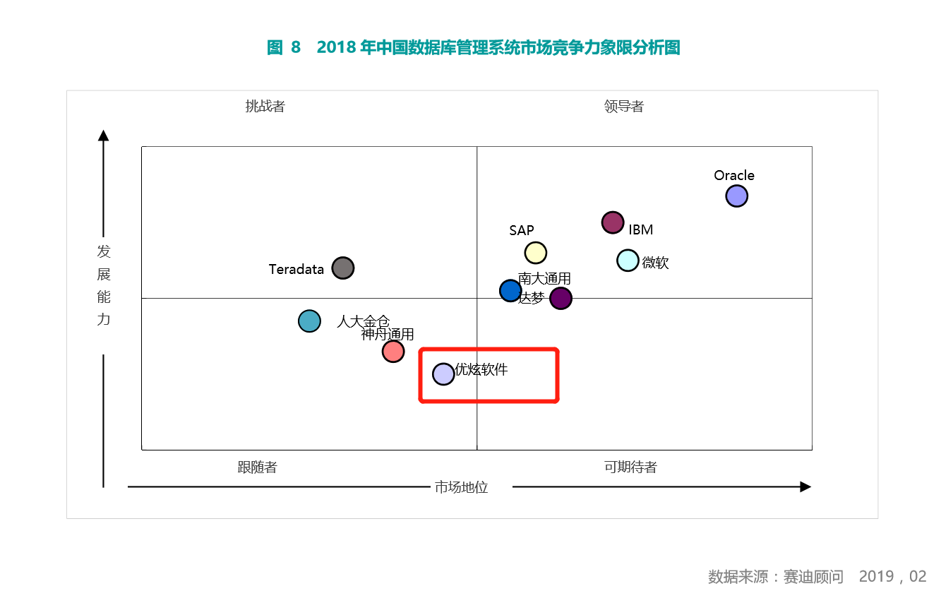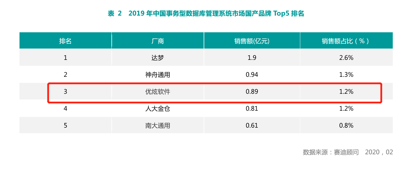 在赛迪顾问最新发布的《2019-2020年中国平台软件市场研究年度报告》,通过对中国数据库管理系统厂商的深度分析调研,优炫软件在国产数据库领域发展势头迅猛,凭借优异的技术和突出的市场表现,位居国产数据库市场排名前三。