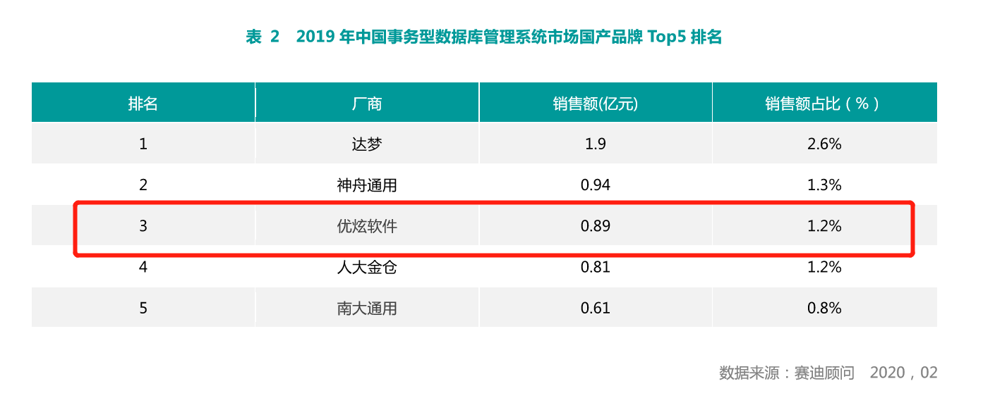 近日,国内权威咨询机构赛迪顾问最新发布《2019-2020年中国平台软件市场研究年度报告》。在本次报告中针对中国数据库管理系统市场调研,国产数据库厂商优炫软件的表现成为一大亮点,从技术实力到市场份额发展势头持续向好,这也是继2017、2018年两次进入数据库市场排名后迎来的新佳绩,