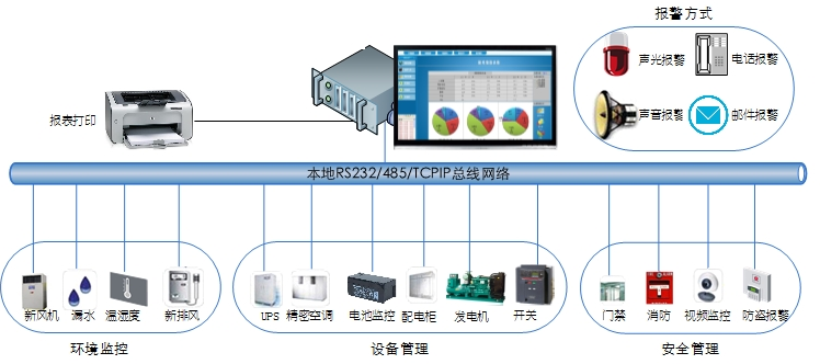 新办公区设置有独立的弱电标准化机房,汇聚公司网络系统、办公自动化系统等业务,同时为公共广播系统、视频监控系统等提供运行保障。为满足机房动力环境的实时监控和实时报警需要,需要部署机房动力环境监控系统,为各种信息系统、办公设备的正常运行提供保障。