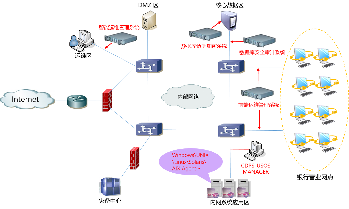 4) 运维管理系统对银行的安全设备、网络设备、主机、数据库及应用软件进行安全运维,采用三权分立,达到事前预防,事中阻断,事后追责的目的。