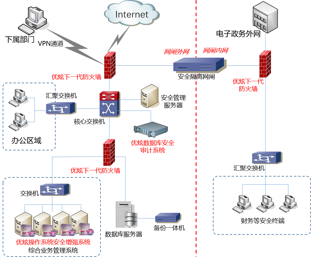 在信息安全方面,在网络层部署优炫下一代防火墙(简称NGF)、网闸设备实现网络层的访问控制、恶意代码防护、入侵防御等;在系统层部署优炫操作系统安全增强系统(简称RS-CDPS),提升操作系统的抗攻击能力,避免来自内部的网络攻击;在应用和数据方面,部署优炫数据库安全审计系统(简称CDPS-DBA),通过多维度保证数据库的安全、稳定运行。