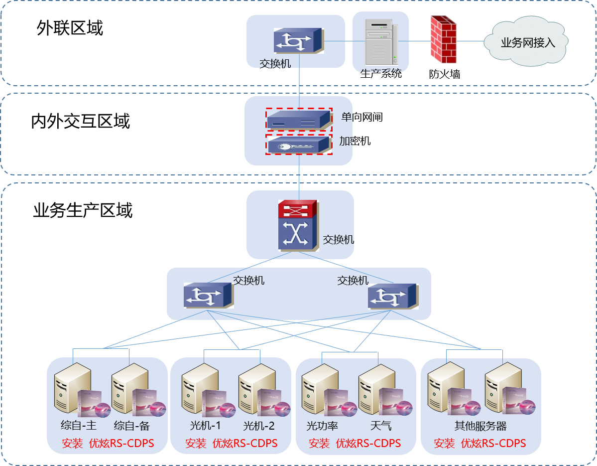 根据电厂的实际要求,通过在整站业务系统的服务器上部署优炫操作系统安全增强系统(简称RS-CDPS)产品,修改服务器操作系统的安全策略、增加安全机制等方法,合理进行安全性加强,提升了关键主机的操作系统安全等级。网络部署示意图如下图: