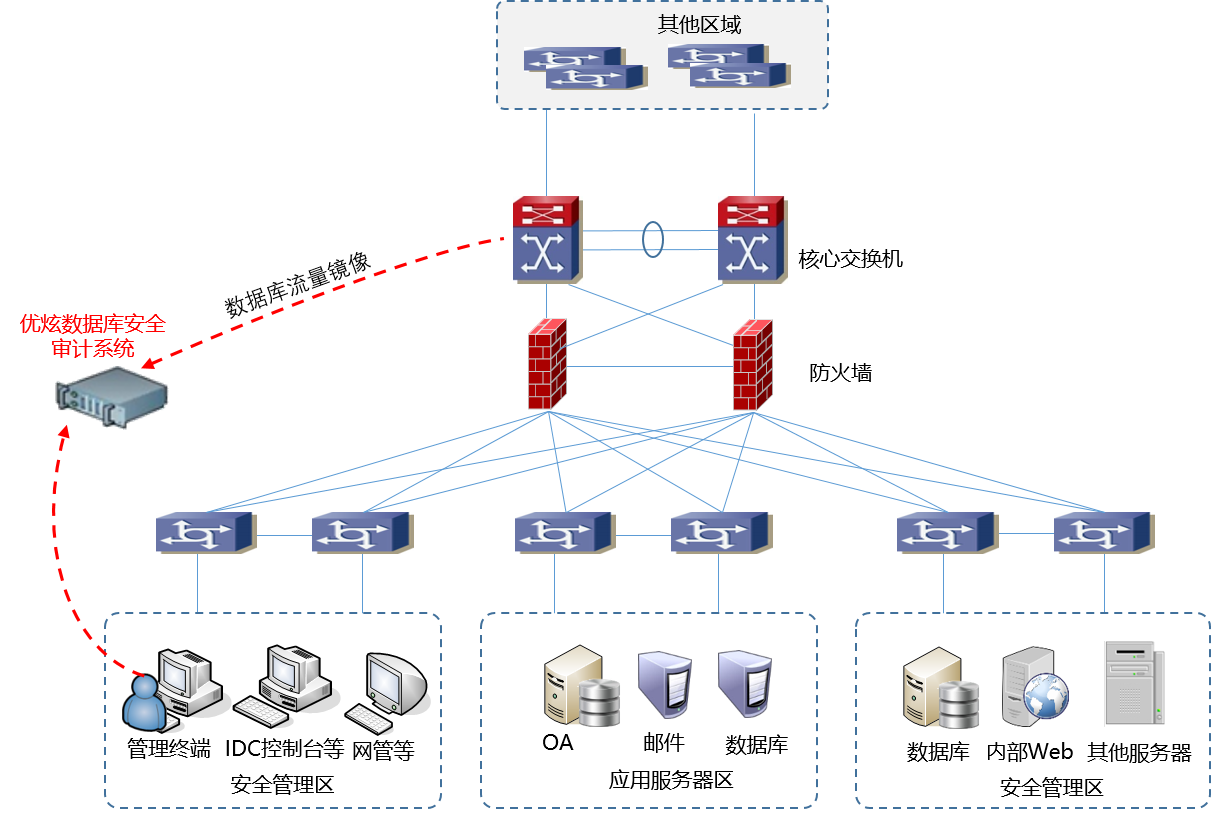 部署示意图说明:优炫数据库安全审计系统旁路部署于医院内网中,一个网络管理口,和一个镜像口接入网络,通过镜像数据抓包记录对数据库的操作,达到审计记录、告警等。