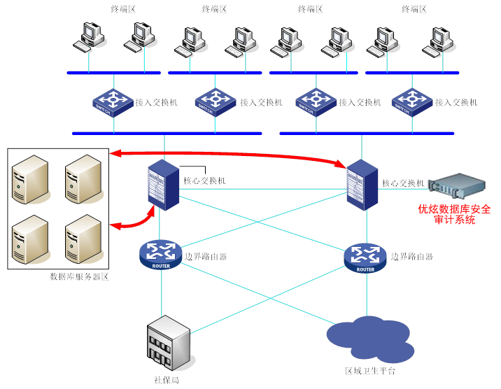 通过部署数据库安全审计系统来监控医院各业务人员对数据库的操作。数据库安全审计系统旁路部署于医院核心交换机上,通过交换机的端口镜像功能将所有访问数据库服务器的流量全部镜像到审计设备的镜像端口上。当开启数据库审计功能之后,就可以对所有做了流量镜像的数据库进行审计。
