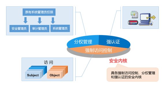 1、三权分立,把超级管理员账号(administrator、root)分解成了安全管理员、审计管理员、操作管理员。有效解决了超级用户权限过大的问题。