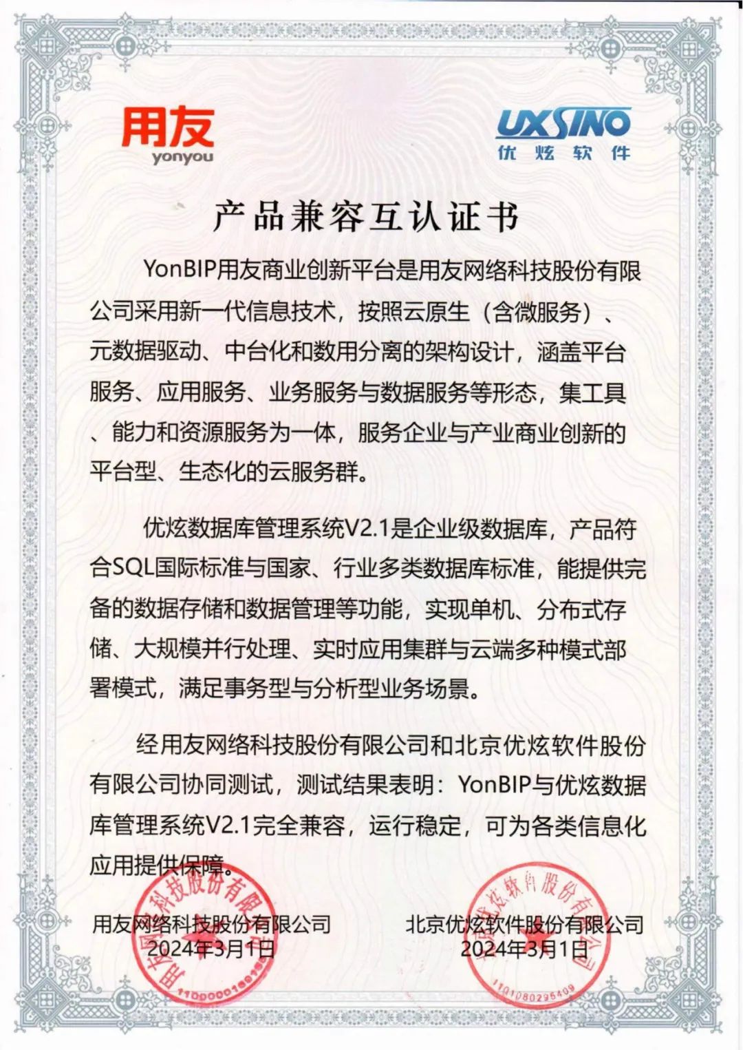 近日,北京优炫软件股份有限公司(以下简称“优炫软件”)与用友网络科技股份有限公司(以下简称“用友”)完成技术认证,优炫数据库管理系统V2.1与用友YonBIP完成产品兼容性测试,并正式签署互认证证书。