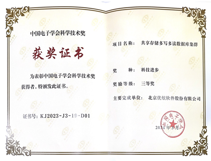 近日,备受瞩目的中国电子学会2023年度科学技术奖正式揭晓,优炫软件共享存储多写多读数据库集群 荣获科学技术三等奖